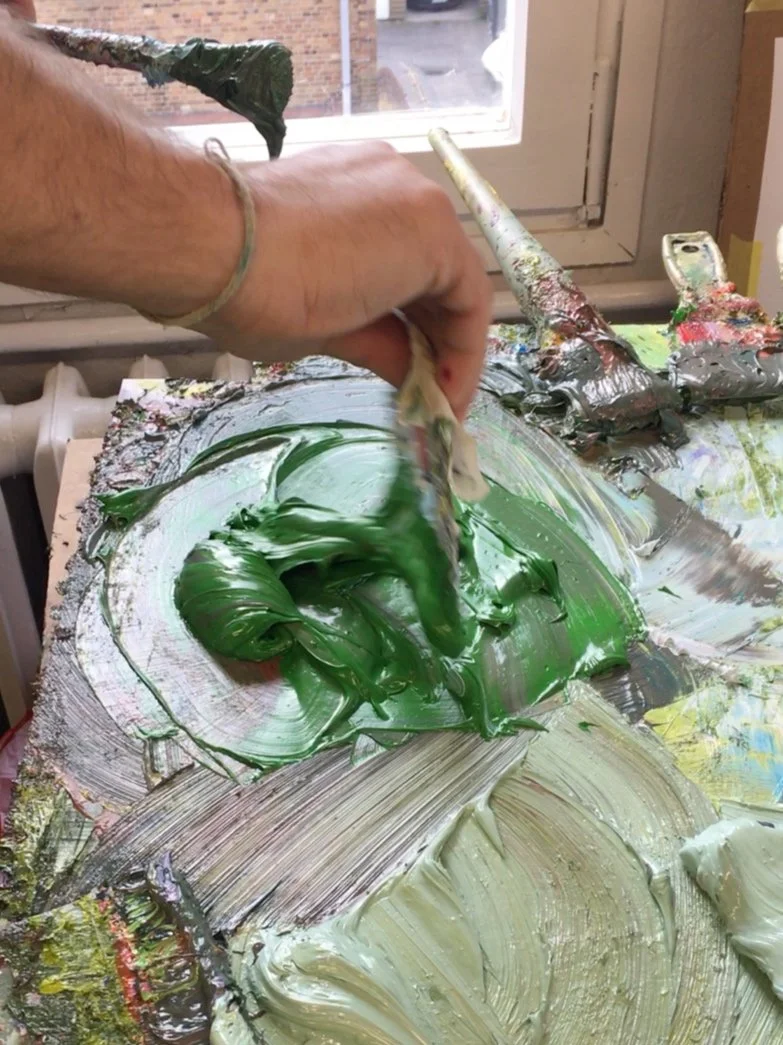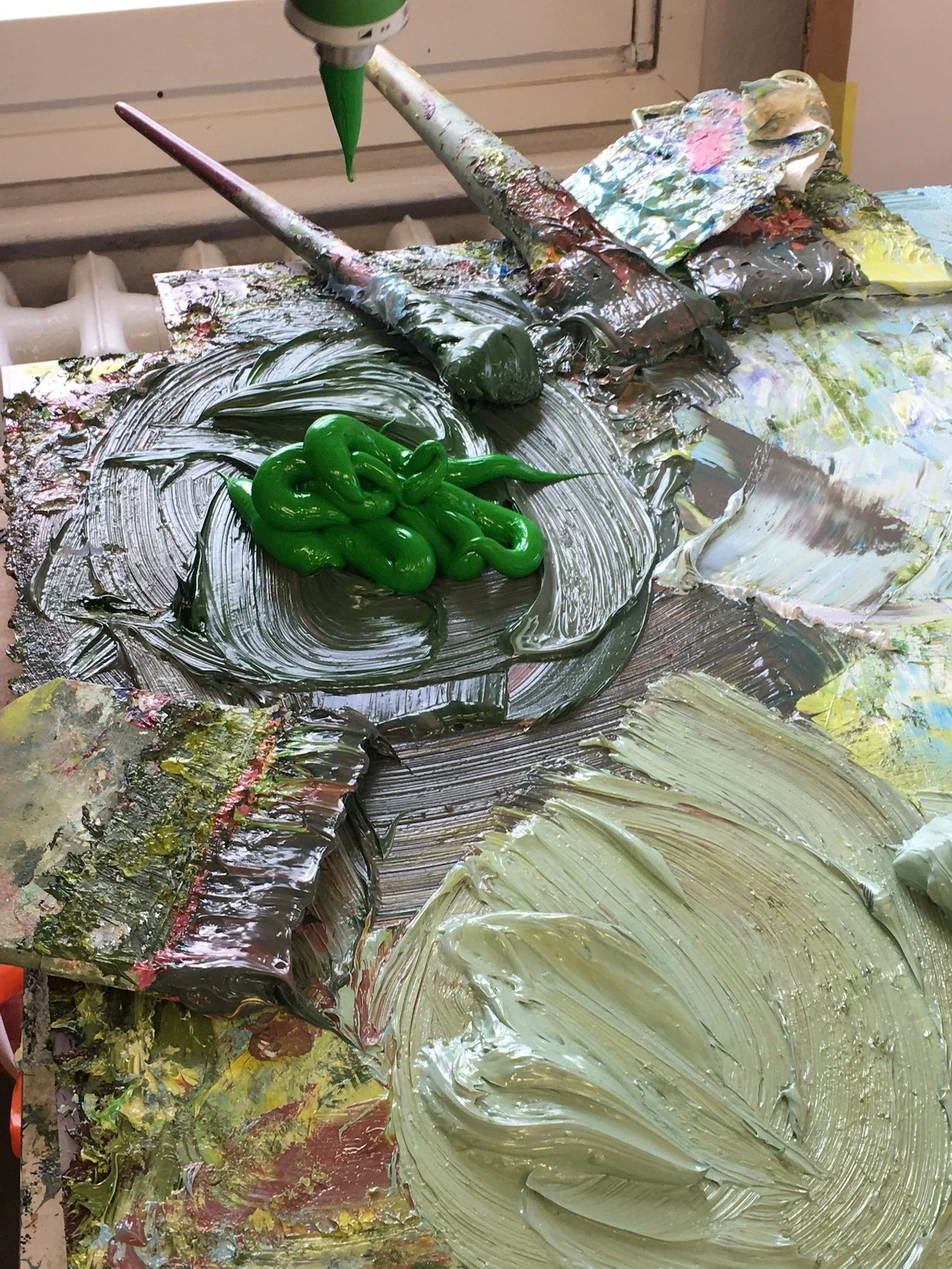 Sometimes it’s not easy to find the right word. When we enter Erik Schmidt’s studio, the first thing that catches our eye are blobs of color: oil paint. But blobs of color is not the right word. The blobs of oil paint are as thick as fish bodies: green, pink-white, purple. Color fish? Such color fish can also be seen on the canvases, because the oil paint is not painted thinly everywhere. Erik throws it onto the painting with a sweep of his brush. As a result, the paintings do not have a smooth surface, but a structure. Like a lunar landscape. Or a deep ocean floor. It takes months for the color fish to dry on the canvases.