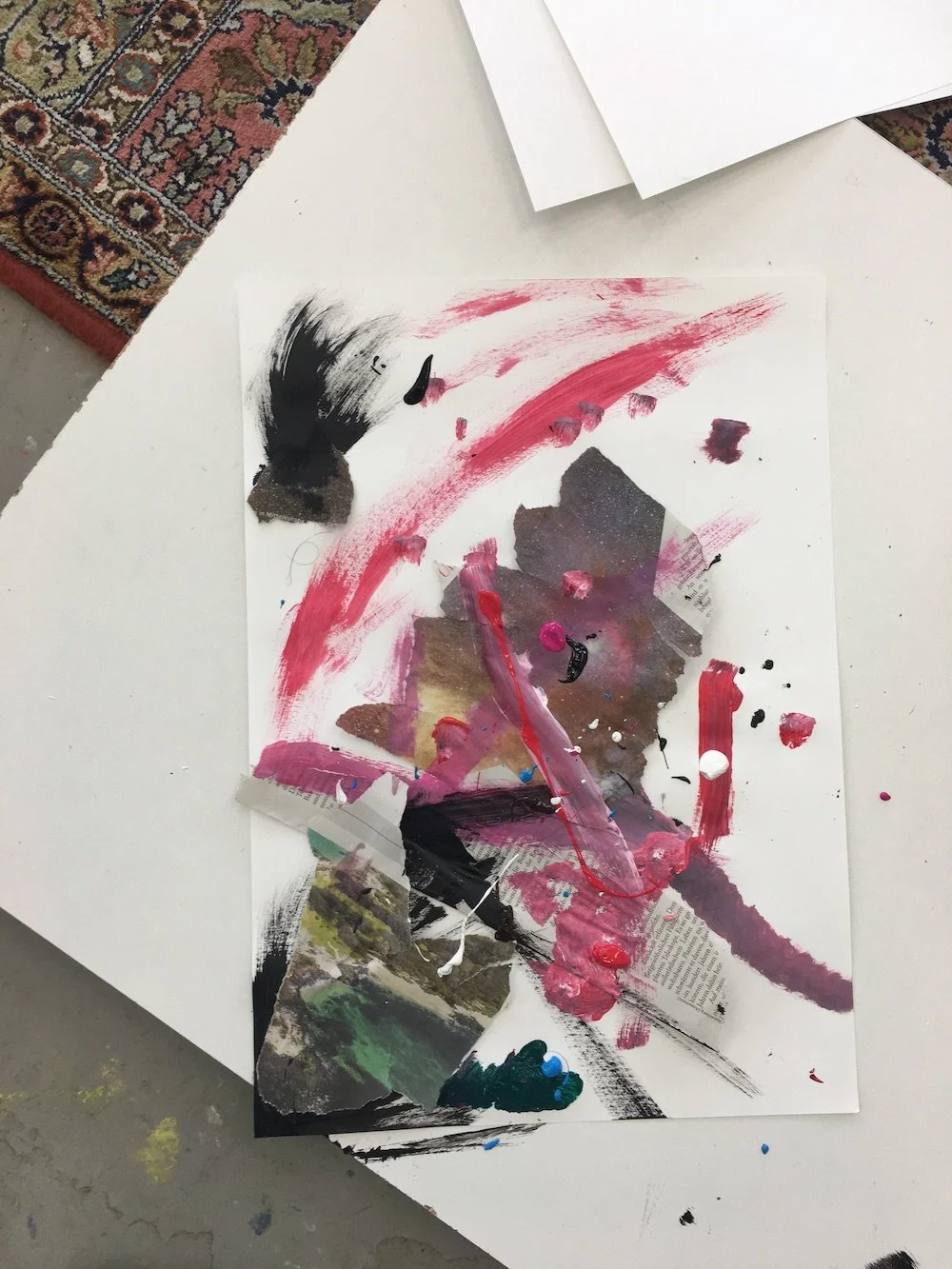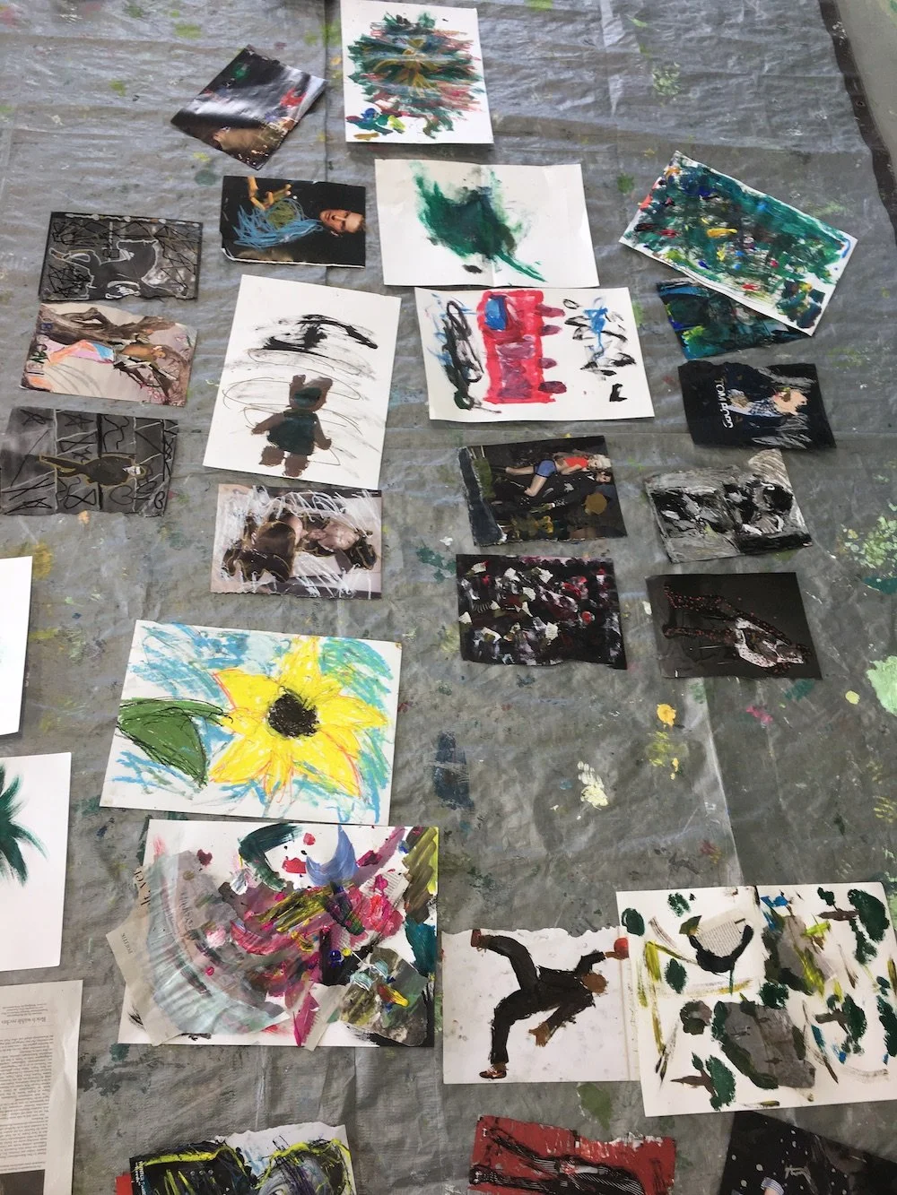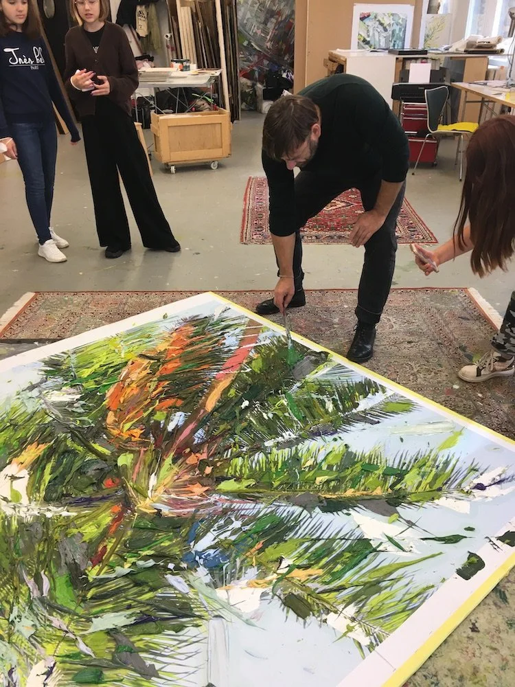 After telling us the story of his exploding palm trees and seeing how they become thicker and more colorful through the application of paint fish, Erik provides us with photos, newspapers and magazines. He has a treasure trove of them. He also gives us crayons, oil paint and all the materials he uses himself. Now we get started and try out what we can do with pictures that are already there. It works amazingly well! At the end of our visit, we don‘t feel any different than the artist: we can‘t take our works with us yet, because they still have to dry. Erik‘s exhibition in Vienna is in a month. By then, many of the color fish on his canvases won‘t be dry either.