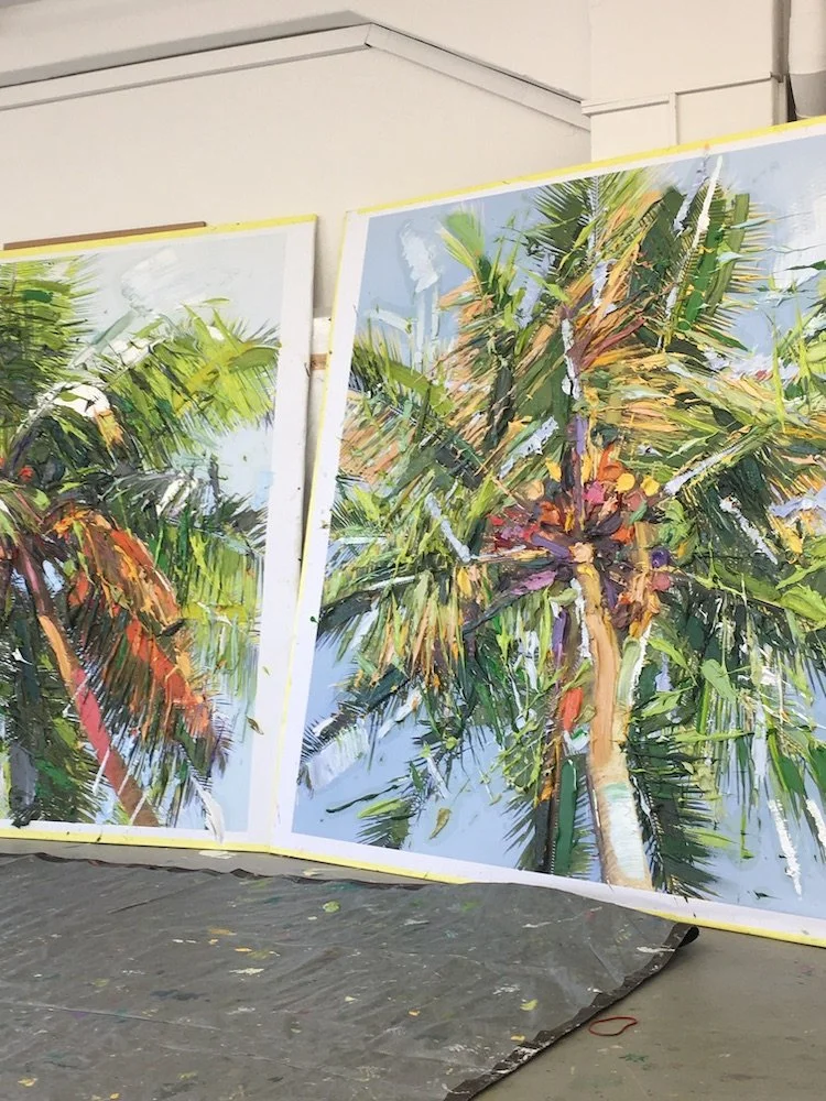 When we visit the painter, he shows us pictures he is painting for an exhibition in Vienna. His studio is often the last stop on a trip; in the spring, for example, he flew to Sri Lanka. That was shortly after Russia invaded Ukraine. There he photographed palm trees. The special thing about his photos is that he usually goes to places for them that are not easily accessible. In Sri Lanka, it is forbidden to lie down in the middle under a palm tree because it is dangerous. If a palm tree drops a coconut, it can easily hit you. Erik photographed the palm trees exactly from this forbidden point: The viewers of the photos look up the trunk of the palm into the crown.