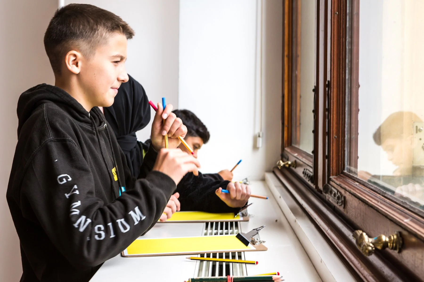 A 5th grade class from Kreuzberg’s Glaßbrenner Elementary School has just arrived at the Gropius Bau for an Ephra workshop. The children wait in anticipation in front of the glass entrance door until the security guard has opened the lock in an elaborate procedure. And then it starts right away!