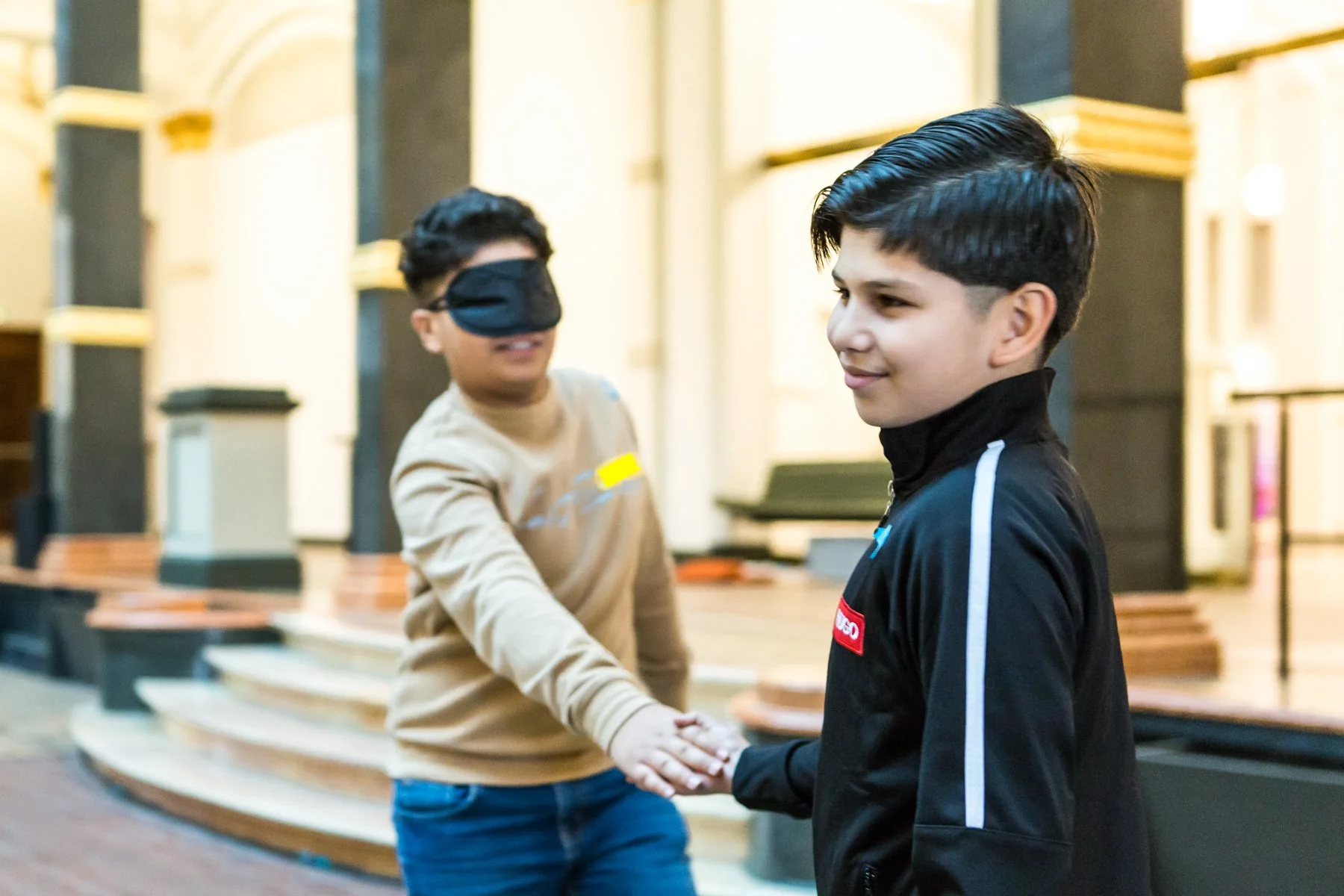 Appropriately, the way into the exhibition is an exercise in trust: two students take turns guiding each other through the large atrium blindfolded. This is more difficult than expected – both for the leading, sighted person and the blind, guided one. There's a staircase coming up, but is it going up or down? How many steps are there and when is the right time to announce an obstacle?
