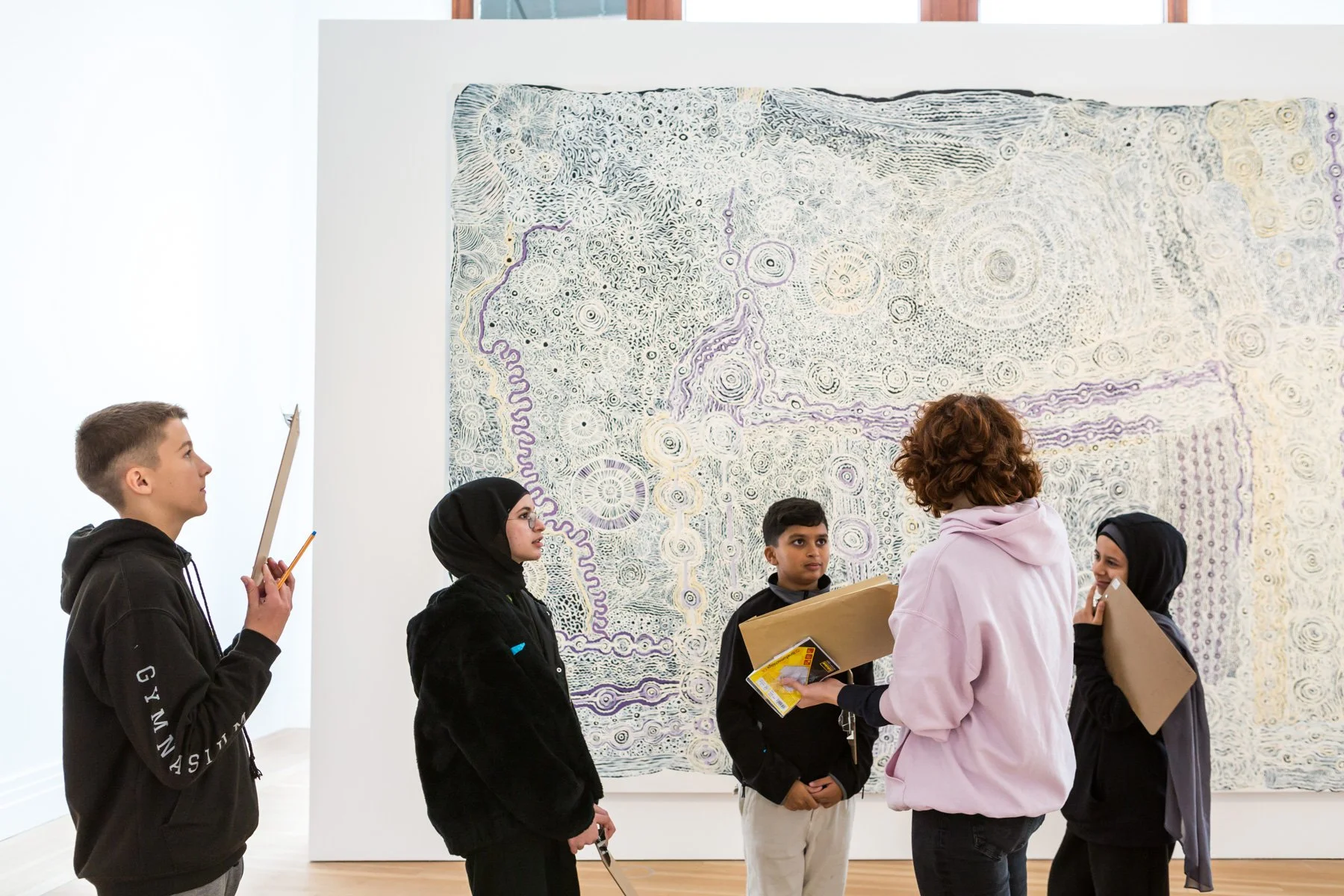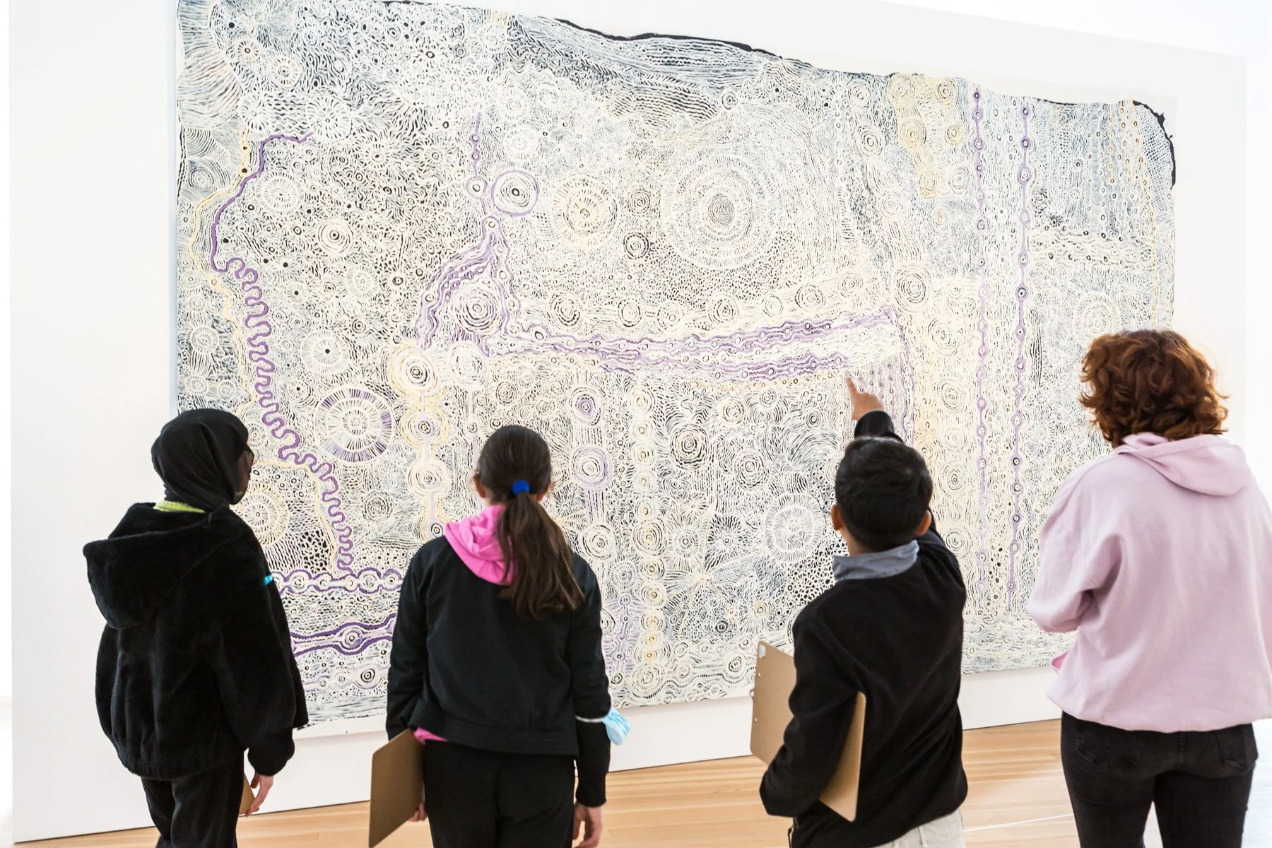 Then we continue – blindfolded again through the atrium – to the work of Maringka Burton and Betty Muffler. How can one describe this large painting? Phrases such as “purple strings with circles”, “very vivid”, “many dots”, and the thickness of the brushstrokes are illustrated on the blind person's hand. Still, when the masks are removed, all the students are surprised at how much larger the painting is – and how it actually looks. With its many brushstrokes in pastel colors, it reminds some of Vincent van Gogh’s “Starry Night”, while others see a summer landscape, lots of movement, or a chain reaction.
