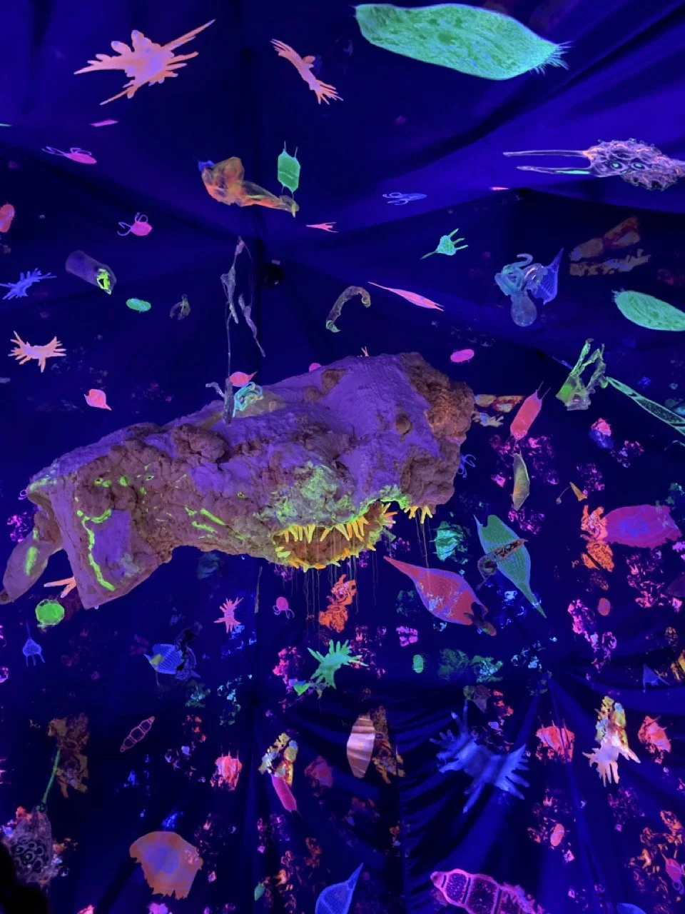 Those are just the right cues, and Malu leads the group to the last stop of the workshop: Anne Duk Hee Jordan’s installation “Worlds Away”. The space feels really far away, is completely dark and simulates a deep sea environment where smaller and larger creatures swim. Here in the darkness, the sensory perception is quite different: you can feel the vibrating floor and a certain heaviness, plus strange sounds that sound muffled, like you're underwater, or as if you're in the heart of a large creature. Some of the fluorescent creatures could be old plastic bottles or bags, and the large one in the middle an animal carcass. Or a comet after all?