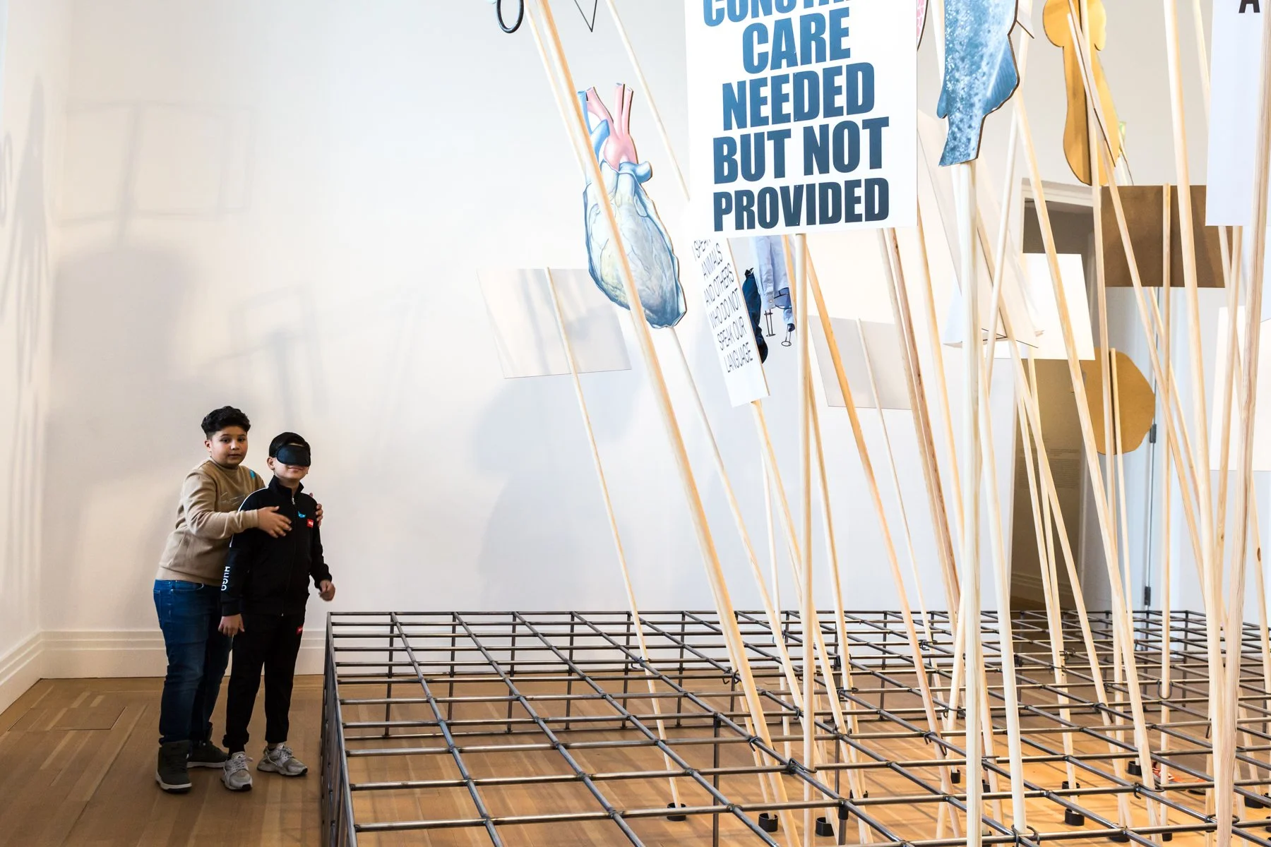 Arriving in front of Eva Koťátková’s installation “Confessions of a Piping System”, the sighted describe to their partners what is in front of them: a metal frame with wooden rods sticking out of it, printed signs on it, animals, small clothes, metal organs. Or is that a fly swatter? Now the others are also allowed to look, to walk around the work and inspect it. “I speak for the sick who cannot afford to be sick” is written on one sign, for example. What could that possibly mean?